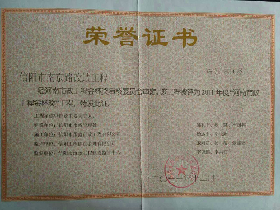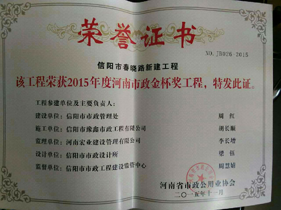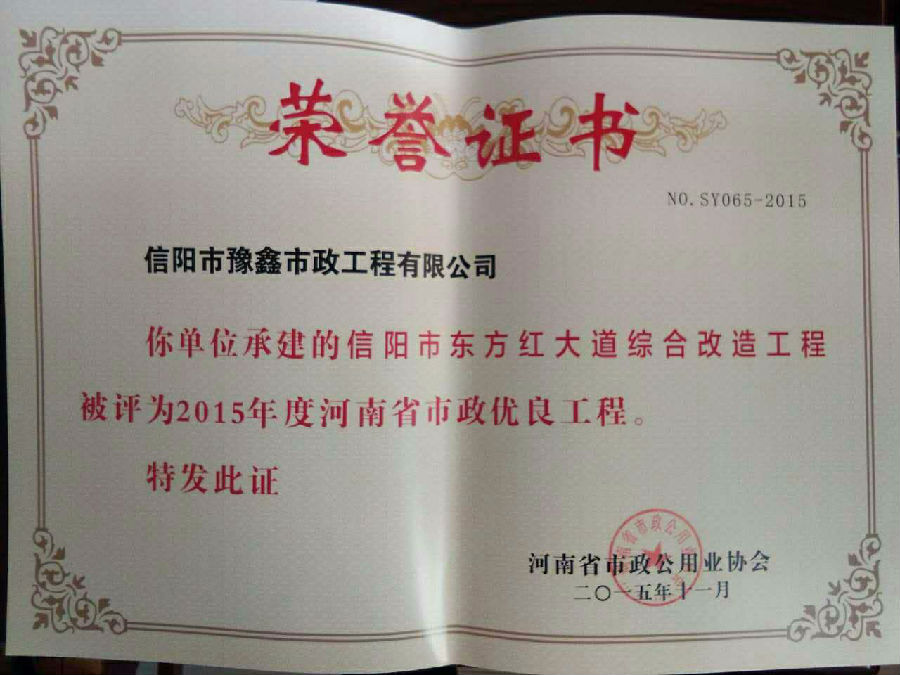 好風(fēng)憑借力,送我上青云。近年來,公司積極參與城市市政基礎(chǔ)設(shè)施建設(shè)施工,積極參與市場(chǎng)競(jìng)爭(zhēng),先后承擔(dān)施工了市政府重點(diǎn)工程南京路道路改造工程、春曉路道路改造工程,東方紅大道道路改造工程、龍江東路新建工程等重點(diǎn)民生工程,其中南京路道路改造工程被省建設(shè)廳評(píng)為“中州杯”, 春曉路和東方紅大道道路改造工程被省建設(shè)廳評(píng)為“省優(yōu)工程”,成為城區(qū)一道道亮麗的風(fēng)景線。參與施工了市典范小區(qū)“臺(tái)北城上城”、“恒大名都”以及師范學(xué)院、職業(yè)技術(shù)學(xué)院、交警支隊(duì)和軍區(qū)道路工程,參與施工了雞公山管理區(qū)、南灣管理區(qū)、明港鎮(zhèn)和羅山縣等部分道路小區(qū)工程施工,累計(jì)大小各類施工工程三百余項(xiàng),企業(yè)影響力不斷擴(kuò)大、輻射力不斷增強(qiáng),市場(chǎng)份額不斷提高,企業(yè)信譽(yù)不斷彰顯,為信陽城市建設(shè)做出了積極貢獻(xiàn),為企業(yè)的可持續(xù)發(fā)展插上了騰飛的翅膀。